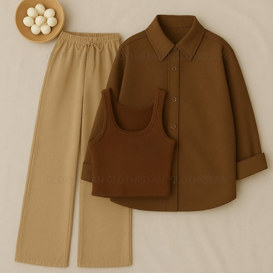 Button-Down Shirt, Rib-Knitted Tank Top & Wide-Leg Trouser Pack of Three